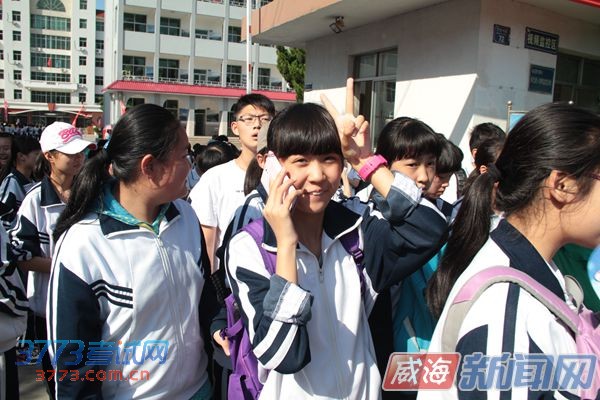 昨日下午,一名参加完考试的女考生走出考场时边听电话边做出“胜利”手势。