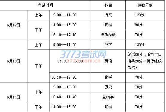 语文、数学、英语、思想品德、物理、化学、历史、生物学、地理学科,考试时间为 2017年6 月 12 日至 14 日。具体日程: