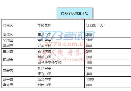 民办学校招生计划县市区学校名称计划数(人)临渭区集才中学200华州区中山中学180蒲城县兴华学校800白水县新华学校200韩城市新蕾中学150司马迁专修学校100高新区永兴中学200正兴中学400富平县蓝光中学1300澄城县创新中学350