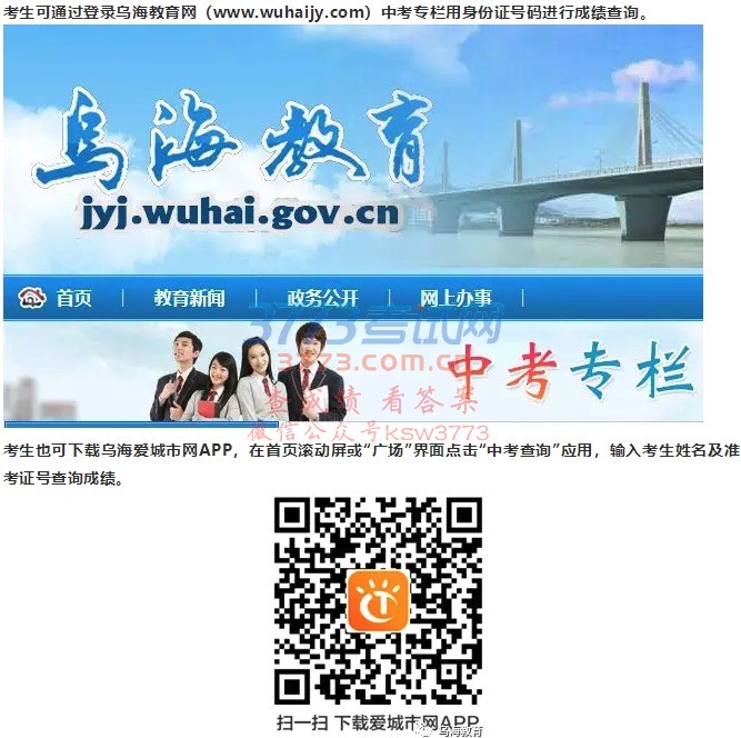 考生也可下载乌海爱城市网APP,在首页滚动屏或“广场”界面点击“中考查询”应用,输入考生姓名及准考证号查询成绩。