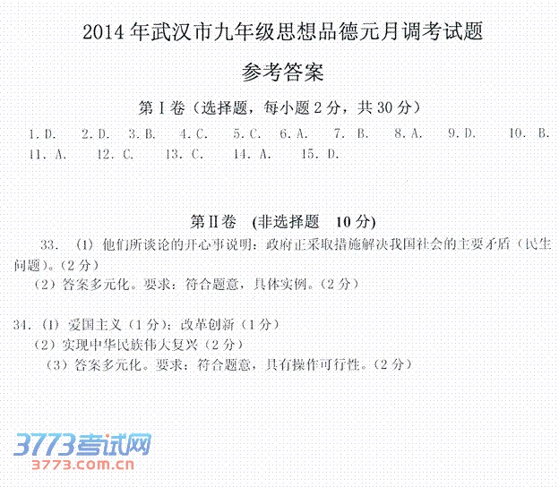 2013-2014学年度武汉市部分学校九年级调研测试思想品德试卷参考答案及评分标准 2014武汉初三元月调考思想品德答案及评分标准