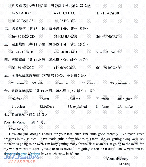 2013-2014学年度武汉市部分学校九年级调研测试英语试卷参考答案及评分标准 2014武汉初三元月调考英语试卷答案及评分标准