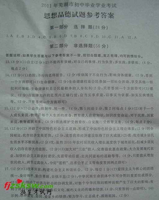 安徽芜湖2011中考政治试题及答案