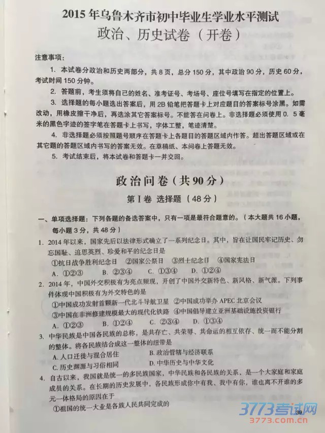 公布新疆中考试题、答案和中考作文。祝各位考生都能取得好的成绩。2015年新疆中考政治试题及答案(图片版):