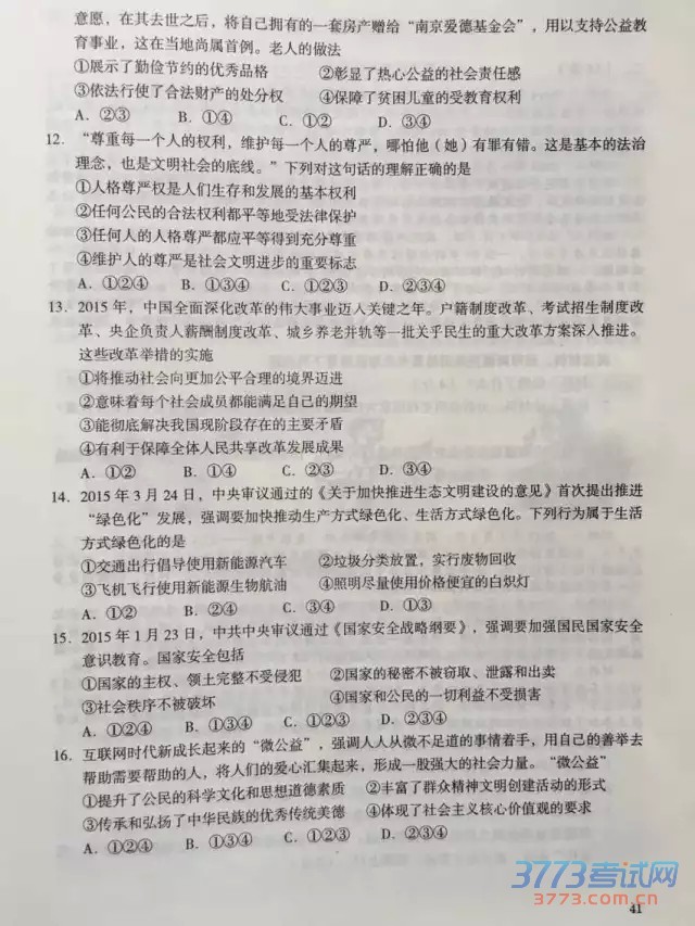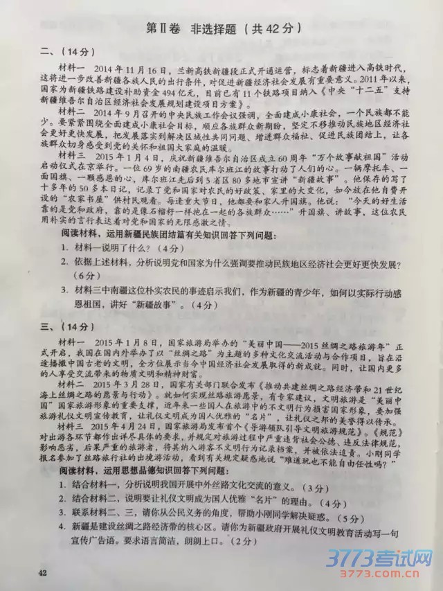2015乌鲁木齐中考政治历史试卷及答案评