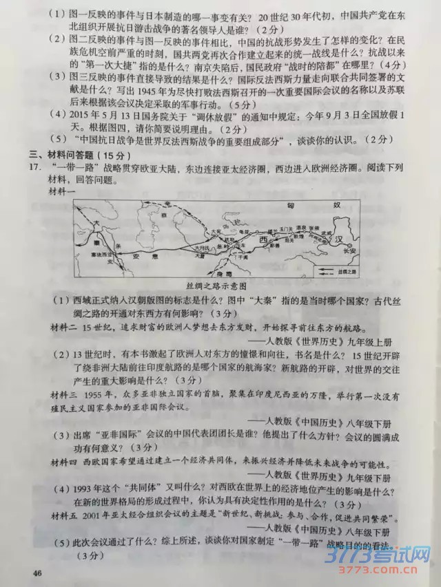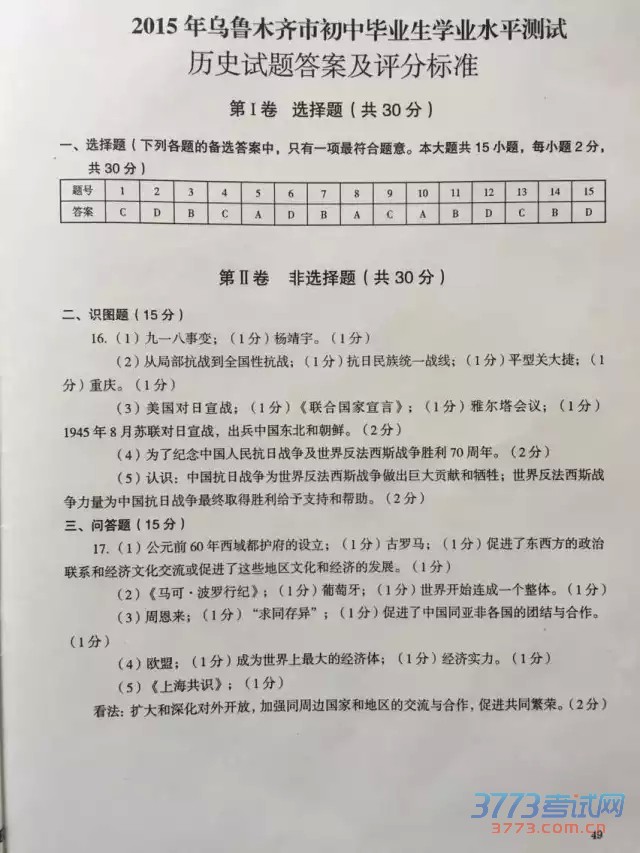 2015乌鲁木齐中考历史试题及答案评分标
