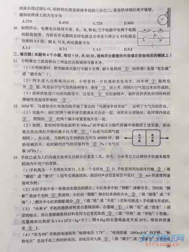 公布新疆中考试题、答案和中考作文。祝各位考生都能取得好的成绩。2015年新疆中考物理试题及答案(图片版):