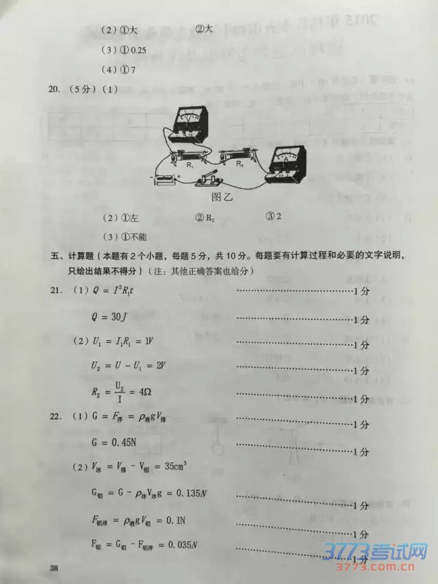 2015乌鲁木齐中考物理试题及答案评分标