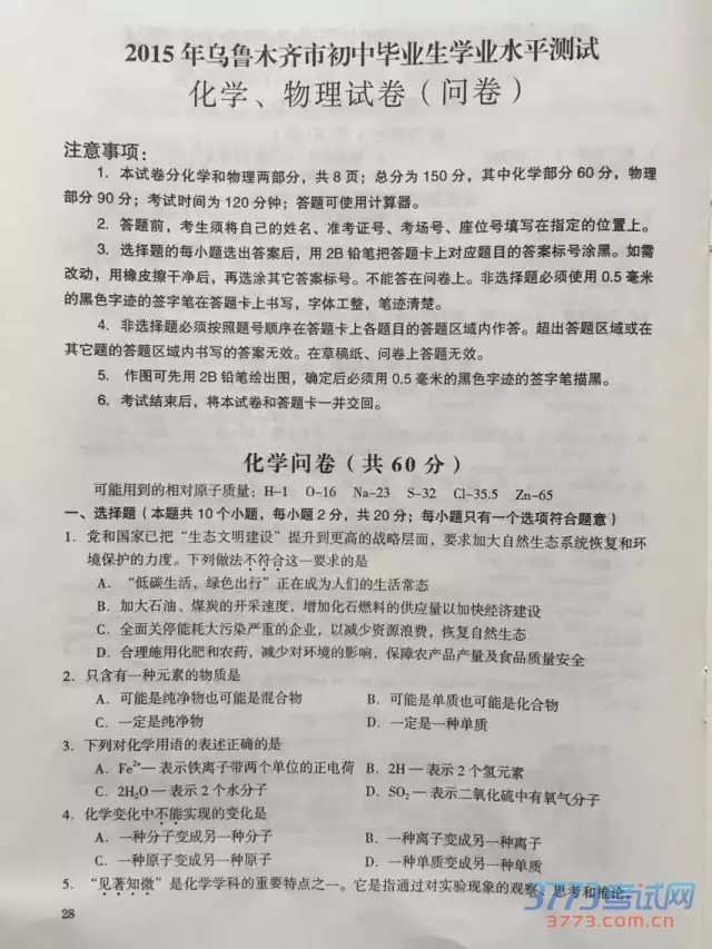 公布新疆中考试题、答案和中考作文。祝各位考生都能取得好的成绩。2015年新疆中考化学试题及答案(图片版):