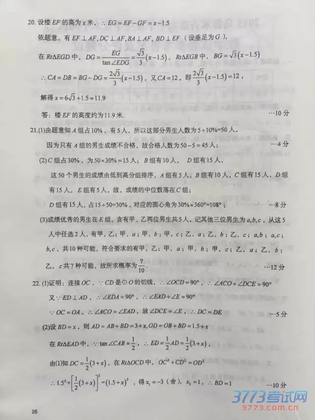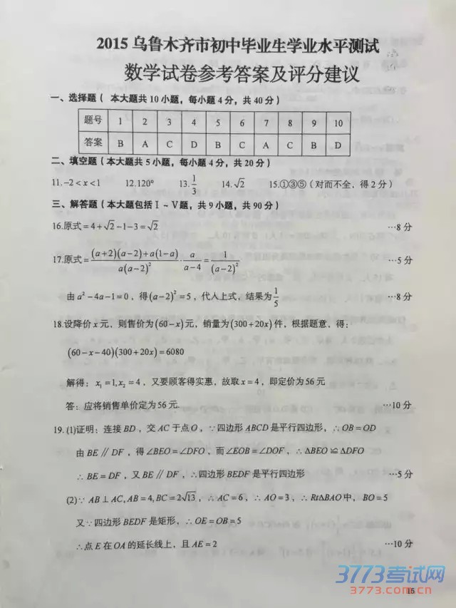 2015乌鲁木齐中考数学试题及答案评分标准