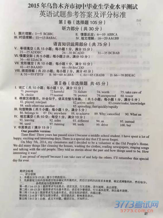 2015乌鲁木齐中考语文试卷及答案评分标准