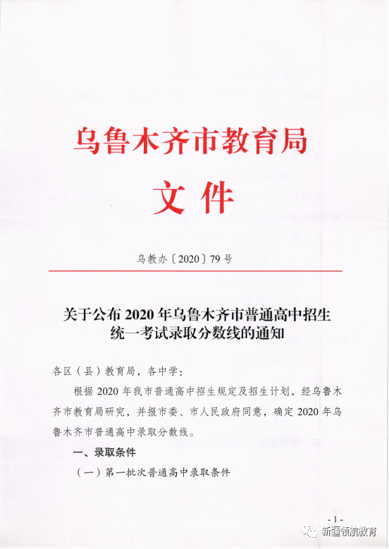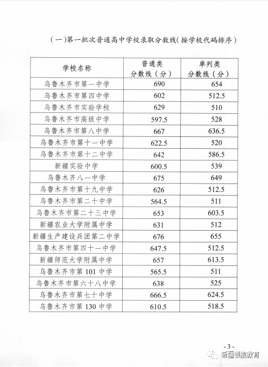 2020年乌鲁木齐市普通高中录取分数线