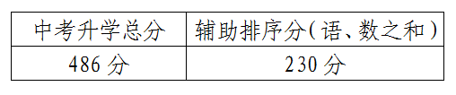 各初中学校分配指标分数线根据本校分配指标数确定,因校而异,但不低于全市分配指标最低控制线459分,并且考查科目合格。同校总分相同考生根据语文、数学成绩之和择优录取。