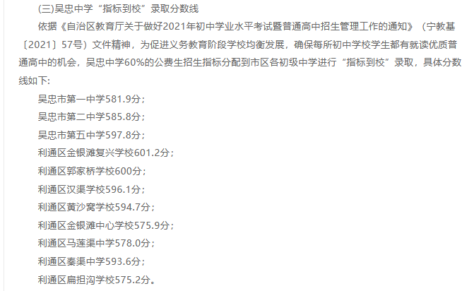 2021年宁夏吴忠中学指标到校录取分数线公布