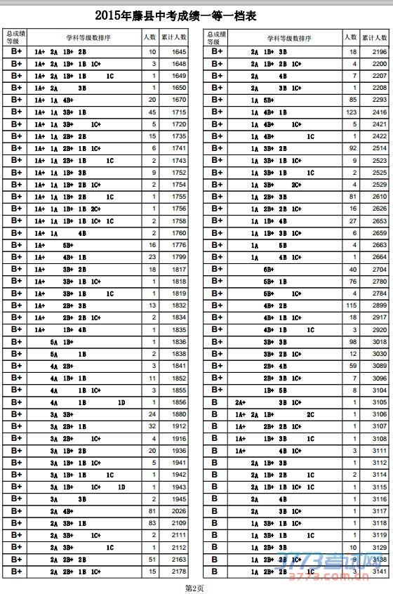 2015年藤县中考成绩一等一档表 总成绩 等级 学科等级数排序 人数 累计人数 总成绩 等级 学科等级数排序 人数 累计人数 A+ 6A+ 14 14 A+ 5 1 A+ A 42 56 A+ 5 1 A+ B+ 5 61 A+ 4 2 A+ A 79 140 A+ 4 11 A+ A B+ 33 173 A+ 4 2 A+ B+ 3 176 A+ 4 11 A+ B+ B 1 177 A+ 3 3 A+ A 104 281 A+ 3 21 A+ A B+ 64 345 A+ 3 12 A+ A B+ 5 350 A+ 2 4 A+ A 70 420 A+ 2 31 A+ A B+ 44 464 A+ 2 22 A+ A B+ 6 470 A+ 2 21 1 A+ A B+ B 1 471 A+ 1 5 A+ A 28 499 A+ 1 41 A+ A B+ 14 513 A+ 14 1 A+ A B 1 514 A+ 1 32 A+ A B+ 1 515 A+ 6A 1 516 A 5 1 A+ A 1 517 A 4 11 A+ A B+ 2 519 A 41 1 A+ A B 2 521 A 4 2 A+ B+ 3 524 A 3 3 A+ A 4 528 A 3 21 A+ A B+ 23 551 A 32 1 A+ A B 9 560 A 3 12 A+ A B+ 21 581 A 3 11 1 A+ A B+ B 6 587 A 3 11 1 A+ A B+ C+ 1 588 A 31 2 A+ A B 1 589 A 3 3 A+ B+ 6 595 A 3 21 A+ B+ B 4 599 A 3 12 A+ B+ B 1 600 A 2 4 A+ A 21 621 A 2 31 A+ A B+ 68 689 A 23 1 A+ A B 6 695 A 2 22 A+ A B+ 71 766 A 2 21 1 A+ A B+ B 16 782 A 2 13 A+ A B+ 31 813 A 2 12 1 A+ A B+ B 11 824 A 2 11 2 A+ A B+ B 2 826 A 2 4 A+ B+ 14 840 A 2 31 A+ B+ B 1 841 A 1 5 A+ A 30 871 A 1 41 A+ A B+ 89 960 A 14 1 A+ A B 3 963 A 1 32 A+ A B+ 124 1087 A 1 31 1 A+ A B+ B 21 1108 A 13 2 A+ A B 3 1111 A 1 23 A+ A B+ 72 1183 A 1 22 1 A+ A B+ B 20 1203 A 1 21 2 A+ A B+ B 1 1204 A 1 14 A+ A B+ 23 1227 A 1 13 1 A+ A B+ B 3 1230 A 1 5 A+ B+ 3 1233 A 6A 14 1247 A 5 1 A B+ 48 1295 A 5 1 A B 1 1296 A 4 2 A B+ 92 1388 A 41 1 A B+ B 4 1392 A 3 3 A B+ 86 1478 A 32 1 A B+ B 17 1495 A 2 4 A B+ 43 1538 A 23 1 A B+ B 2 1540 A 1 5 A B+ 5 1545 A 6B+ 1 1546 B+ 3 11 1 A+ A B+ B 3 1549 B+ 23 1 A+ A C 1 1550 B+ 2 22 A+ A B+ 1 1551 B+ 2 21 1 A+ A B+ B 3 1554 B+ 2 21 1 A+ A B+ C+ 2 1556 B+ 22 2 A+ A B 2 1558 B+ 2 12 1 A+ A B+ B 2 1560 B+ 2 11 2 A+ A B+ B 9 1569 B+ 2 11 11 A+ A B+ B C+ 1 1570 B+ 2 4 A+ B+ 1 1571 B+ 2 31 A+ B+ B 3 1574 B+ 2 22 A+ B+ B 8 1582 B+ 2 13 A+ B+ B 2 1584 B+ 14 1 A+ A B 2 1586 B+ 14 1 A+ A C+ 1 1587 B+ 1 32 A+ A B+ 1 1588 B+ 1 31 1 A+ A B+ B 4 1592 B+ 1 31 1 A+ A B+ C+ 2 1594 B+ 13 2 A+ A B 3 1597 B+ 1 23 A+ A B+ 6 1603 B+ 1 22 1 A+ A B+ B 30 1633 B+ 1 22 1 A+ A B+ C+ 2 1635 第1页2015年藤县中考成绩一等一档表 总成绩 等级 学科等级数排序 人数 累计人数 总成绩 等级 学科等级数排序 人数 累计人数 B+ 1 21 2 A+ A B+ B 10 1645 B+ 1 21 11 A+ A B+ B C+ 3 1648 B+ 1 21 1 1 A+ A B+ B C 1 1649 B+ 12 3 A+ A B 1 1650 B+ 1 14 A+ A B+ 20 1670 B+ 1 13 1 A+ A B+ B 45 1715 B+ 1 13 1 A+ A B+ C+ 5 1720 B+ 1 12 2 A+ A B+ B 15 1735 B+ 1 12 11 A+ A B+ B C+ 6 1741 B+ 1 12 1 1 A+ A B+ B C 2 1743 B+ 1 11 3 A+ A B+ B 9 1752 B+ 1 11 21 A+ A B+ B C+ 2 1754 B+ 1 11 2 1 A+ A B+ B C 1 1755 B+ 1 11 12 A+ A B+ B C+ 1 1756 B+ 1 11 11 1 A+ A B+ B C+ C 2 1758 B+ 11 4 A+ A B 2 1760 B+ 1 5 A+ B+ 16 1776 B+ 1 41 A+ B+ B 23 1799 B+ 1 32 A+ B+ B 18 1817 B+ 1 3 11 A+ B+ B C+ 1 1818 B+ 1 31 1 A+ B+ B C 1 1819 B+ 1 23 A+ B+ B 13 1832 B+ 1 2 21 A+ B+ B C+ 2 1834 B+ 1 14 A+ B+ B 1 1835 B+ 5 1 A B+ 1 1836 B+ 5 1 A B 2 1838 B+ 4 2 A B+ 3 1841 B+ 41 1 A B+ B 11 1852 B+ 4 11 A B C+ 3 1855 B+ 41 1 A B D 1 1856 B+ 3 3 A B+ 24 1880 B+ 32 1 A B+ B 32 1912 B+ 32 1 A B+ C+ 4 1916 B+ 31 2 A B+ B 20 1936 B+ 31 11 A B+ B C+ 5 1941 B+ 31 1 1 A B+ B C 1 1942 B+ 31 1 1 A B+ C+ D 1 1943 B+ 3 3 A B 2 1945 B+ 2 4 A B+ 81 2026 B+ 23 1 A B+ B 83 2109 B+ 23 1 A B+ C+ 2 2111 B+ 23 1 A B+ C 1 2112 B+ 22 2 A B+ B 51 2163 B+ 22 11 A B+ B C+ 15 2178 B+ 21 3 A B+ B 18 2196 B+ 21 21 A B+ B C+ 4 2200 B+ 2 4 A B 7 2207 B+ 2 31 A B C+ 1 2208 B+ 1 5 A B+ 85 2293 B+ 14 1 A B+ B 123 2416 B+ 14 1 A B+ C+ 5 2421 B+ 14 1 A B+ C 1 2422 B+ 13 2 A B+ B 92 2514 B+ 13 11 A B+ B C+ 9 2523 B+ 13 1 1 A B+ B C 2 2525 B+ 13 2 A B+ C+ 4 2529 B+ 12 3 A B+ B 81 2610 B+ 12 21 A B+ B C+ 16 2626 B+ 11 4 A B+ B 27 2653 B+ 11 31 A B+ B C+ 6 2659 B+ 1 5 A B 4 2663 B+ 1 41 A B C+ 1 2664 B+ 6B+ 40 2704 B+ 5 1 B+ B 76 2780 B+ 5 1 B+ C+ 4 2784 B+ 4 2 B+ B 115 2899 B+ 4 11 B+ B C+ 18 2917 B+ 41 1 B+ B C 3 2920 B+ 3 3 B+ B 98 3018 B+ 3 21 B+ B C+ 12 3030 B+ 2 4 B+ B 59 3089 B+ 2 31 B+ B C+ 7 3096 B+ 1 5 B+ B 8 3104 B 2 31 A+ B C+ 1 3105 B 1 21 2 A+ A B+ C 1 3106 B 1 2 21 A+ B+ B C+ 1 3107 B 1 13 1 A+ B+ B C 1 3108 B 1 41 A+ B C+ 3 3111 B 21 3 A B+ B 1 3112 B 21 2 1 A B+ B C 2 3114 B 21 11 1 A B+ B C+ C 1 3115 B 2 4 A B 1 3116 B 2 31 A B C+ 1 3117 B 13 11 A B+ B C+ 1 3118 B 13 1 1 A B+ B C 1 3119 B 12 3 A B+ B 10 3129 B 12 21 A B+ B C+ 9 3138 B 12 2 1 A B+ B C 3 3141 第2页2015年藤县中考成绩一等一档表 总成绩 等级 学科等级数排序 人数 累计人数 总成绩 等级 学科等级数排序 人数 累计人数 B 12 2 1 A B+ B D 1 3142 B 12 12 A B+ B C+ 5 3147 B 12 11 1 A B+ B C+ C 4 3151 B 1 2 1 11 A B+ B C D 1 3152 B 11 4 A B+ B 16 3168 B 11 31 A B+ B C+ 18 3186 B 11 3 1 A B+ B C 4 3190 B 11 22 A B+ B C+ 9 3199 B 11 21 1 A B+ B C+ C 3 3202 B 11 2 2 A B+ B C 1 3203 B 11 13 A B+ B C+ 1 3204 B 11 12 1 A B+ B C+ C 1 3205 B 11 11 2 A B+ B C+ C 1 3206 B 1 5 A B 4 3210 B 1 41 A B C+ 8 3218 B 141 A B C 1 3219 B 1 32 A B C+ 7 3226 B 1 31 1 A B C+ C 2 3228 B 1 23 A B C+ 7 3235 B 1 22 1 A B C+ C 2 3237 B 1 21 2 A B C+ C 1 3238 B 1 2 1 11 A B C+ C D 1 3239 B 1 14 A B C+ 1 3240 B 1 13 1 A B C+ C 2 3242 B 1 41 A C+ C 1 3243 B 5 1 B+ C+ 1 3244 B 4 2 B+ B 7 3251 B 4 11 B+ B C+ 4 3255 B 41 1 B+ B C 3 3258 B 4 2 B+ C+ 1 3259 B 4 11 B+ C+ D 1 3260 B 4 2 B+ C 1 3261 B 3 3 B+ B 45 3306 B 3 21 B+ B C+ 40 3346 B 32 1 B+ B C 6 3352 B 32 1 B+ B E 1 3353 B 3 12 B+ B C+ 13 3366 B 3 11 1 B+ B C+ C 4 3370 B 3 3 B+ C+ 1 3371 B 3 21 B+ C+ C 1 3372 B 2 4 B+ B 102 3474 B 2 31 B+ B C+ 71 3545 B 23 1 B+ B C 20 3565 B 2 22 B+ B C+ 39 3604 B 2 21 1 B+ B C+ C 12 3616 B 2 21 1 B+ B C+ D 1 3617 B 2 2 11 B+ B C D 1 3618 B 2 13 B+ B C+ 9 3627 B 2 12 1 B+ B C+ C 4 3631 B 2 11 2 B+ B C+ C 1 3632 B 2 1 1 11 B+ B C+ C D 1 3633 B 2 4 B+ C+ 3 3636 B 2 31 B+ C+ D 2 3638 B 1 5 B+ B 151 3789 B 1 41 B+ B C+ 144 3933 B 14 1 B+ B C 24 3957 B 14 1 B+ B D 1 3958 B 1 32 B+ B C+ 113 4071 B 1 31 1 B+ B C+ C 33 4104 B 1 31 1 B+ B C+ D 2 4106 B 1 31 1 B+ B C+ E 2 4108 B 13 2 B+ B C 3 4111 B 1 23 B+ B C+ 70 4181 B 1 22 1 B+ B C+