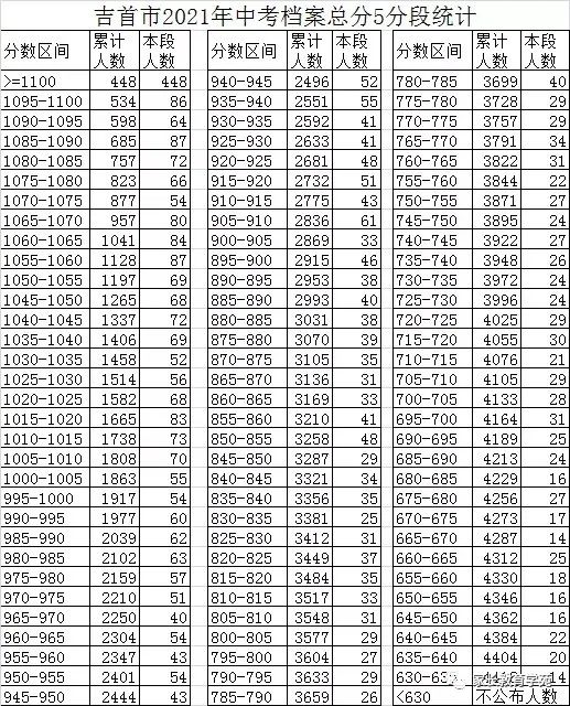 2021年湖南湘西吉首市中考成绩5分段统计表