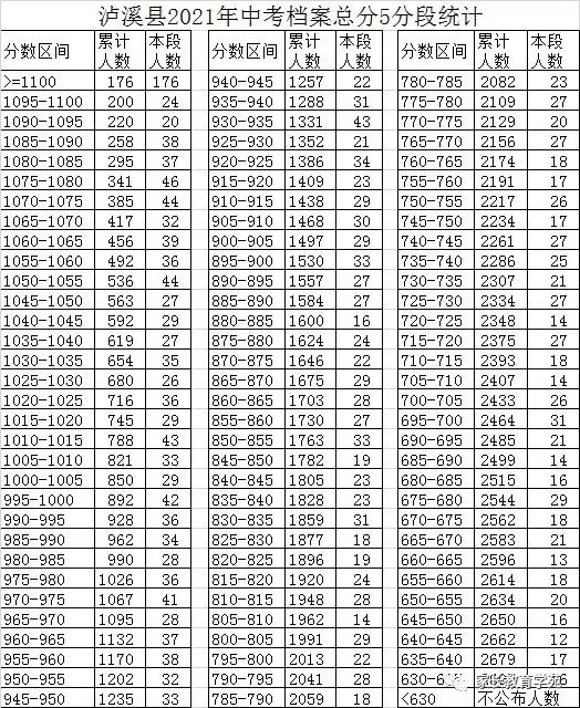 2021年湖南湘西泸溪县中考成绩5分段统计表