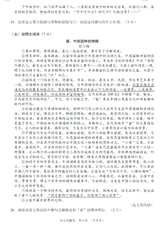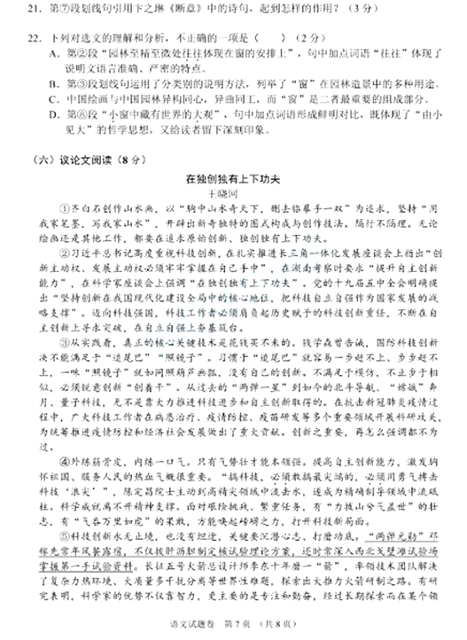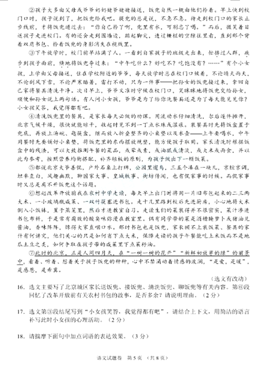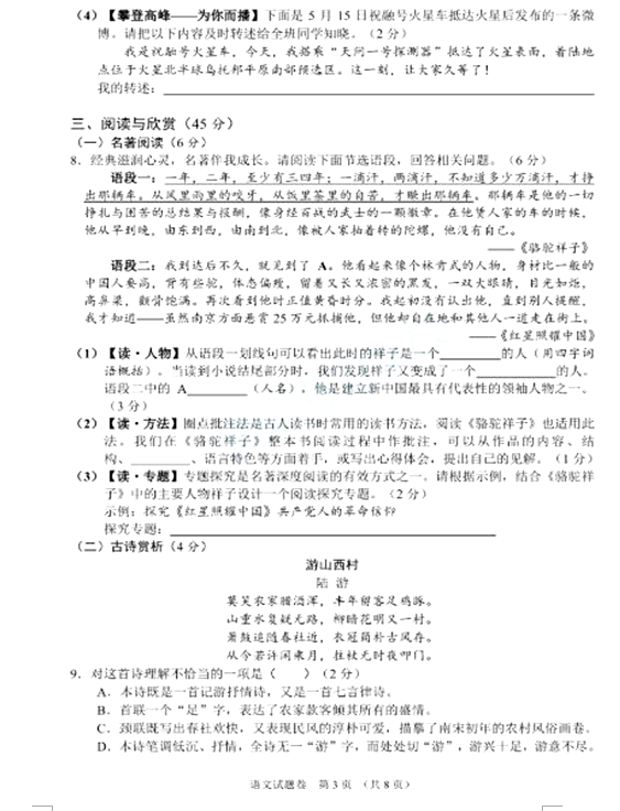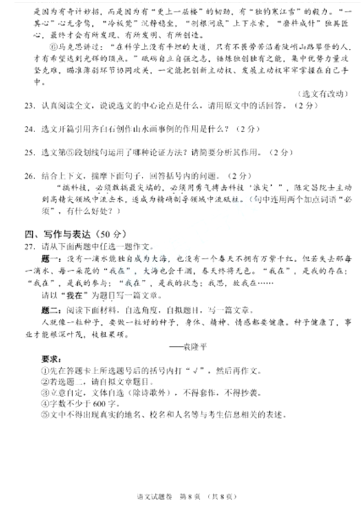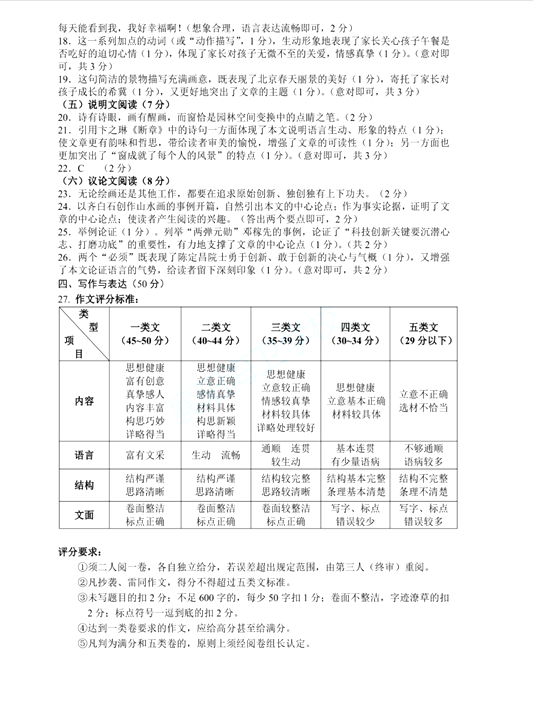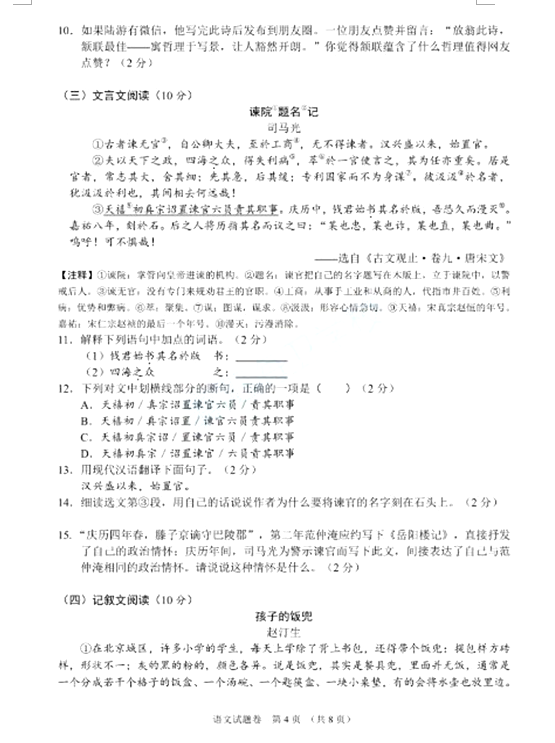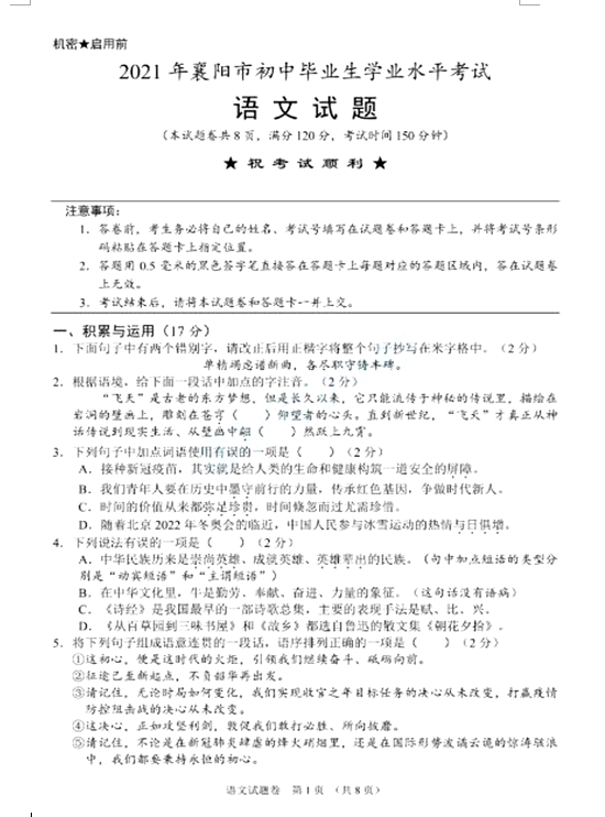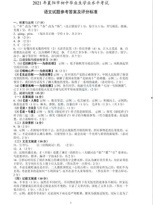 2021襄阳中考语文试题及答案评分标准发布