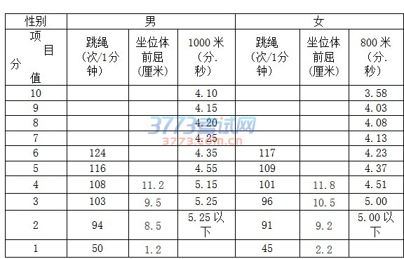 以下成绩且坚持跑完的得2分。2、跳绳、坐位体前屈二项指标的评分在