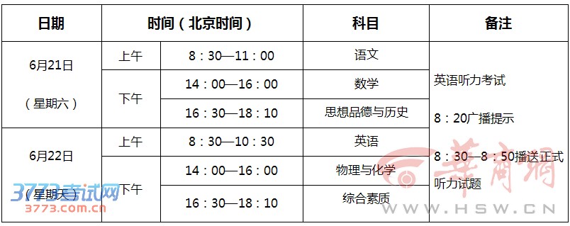 初中毕业生升学学业和综合素质统一考试时间为2014年6月21日至22日。具体考试时间为: