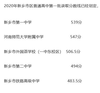 2020年新乡市区普通高中第一批录取分数线 2020年新乡市区普通高中第一批录取分数线已经划定,现对社会公布。新乡市第一中学 539分河南师范大学附属中学 547分新乡市外国语学校(一中东校区) 506.5分新乡市第二中学 494分新乡市铁路高级中学 483.5分