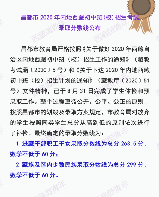 昌都市2020年内地西藏初中班(校)招生考试录取分数线公布