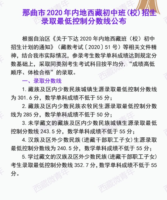 那曲市2020年内地西藏初中班(校)招生录取最低控制分数线公布