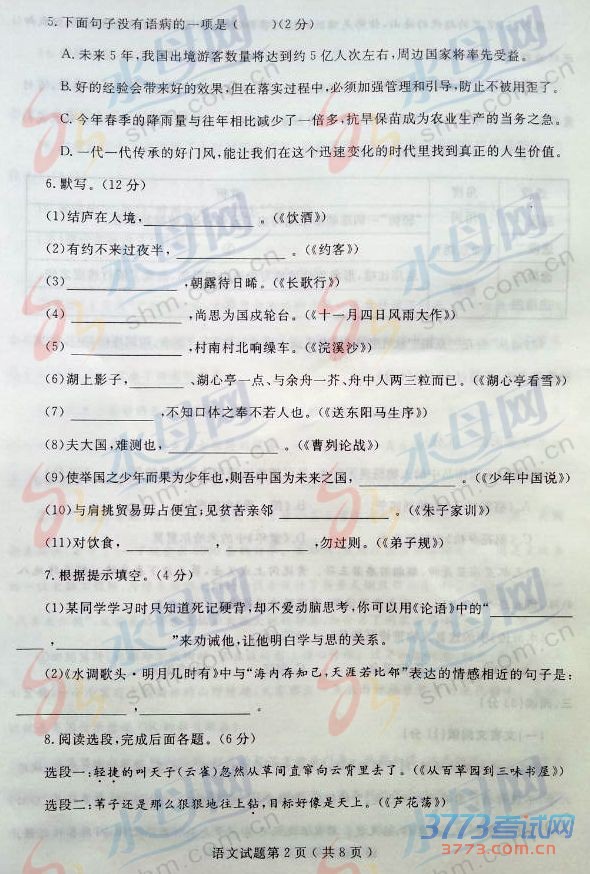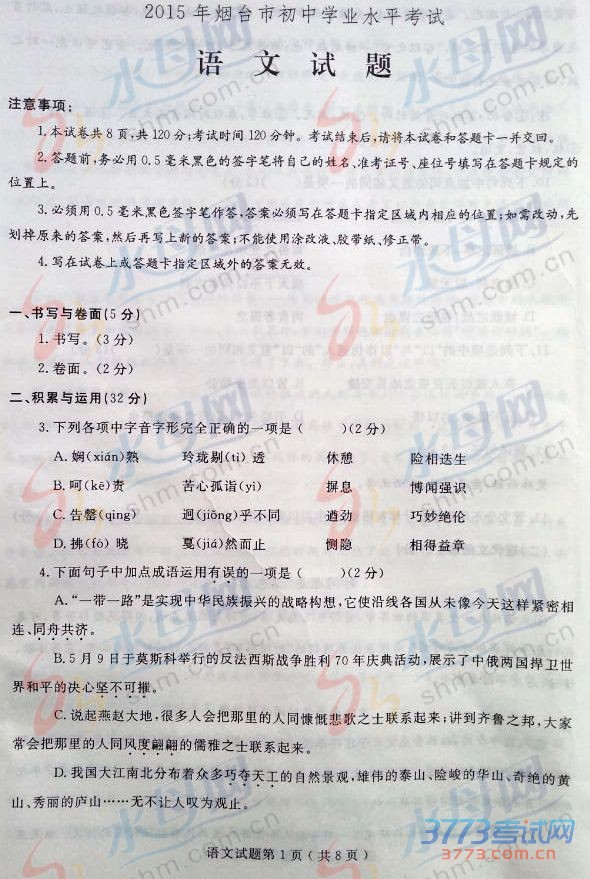 2015烟台中考语文试题免费公布