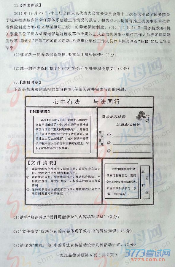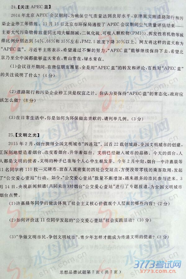 2015烟台中考思想品德试题免费发布