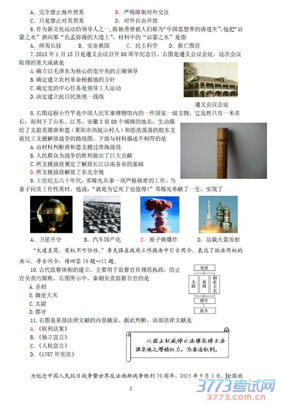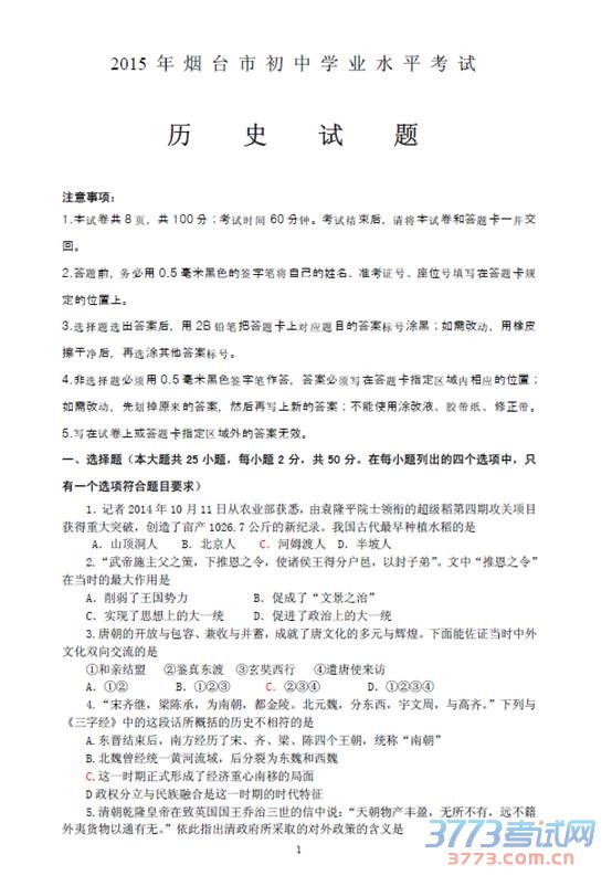 及时公布山东中考试题、答案和高考作文。祝各位考生都能取得好的成绩。2015年山东烟台中考历史试题(图片版):
