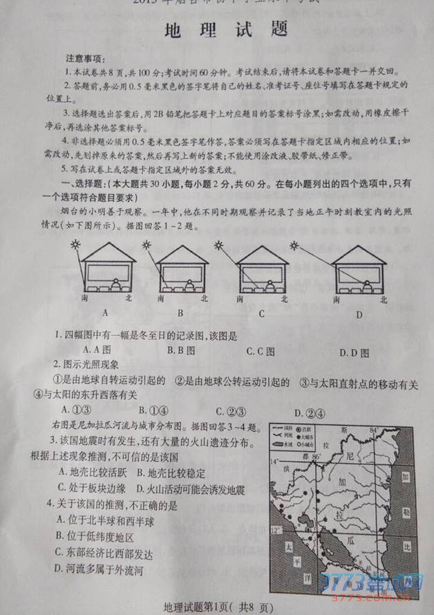 公布山东中考试题、答案和高考作文。祝各位考生都能取得好的成绩。2015年山东烟台中考地理试题(图片版):