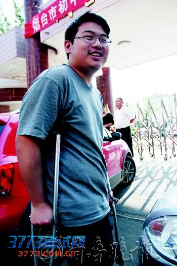 烟台十中考点外,在看考场的学生中,拄着拐杖的一中学生郭传亮分外扎眼。