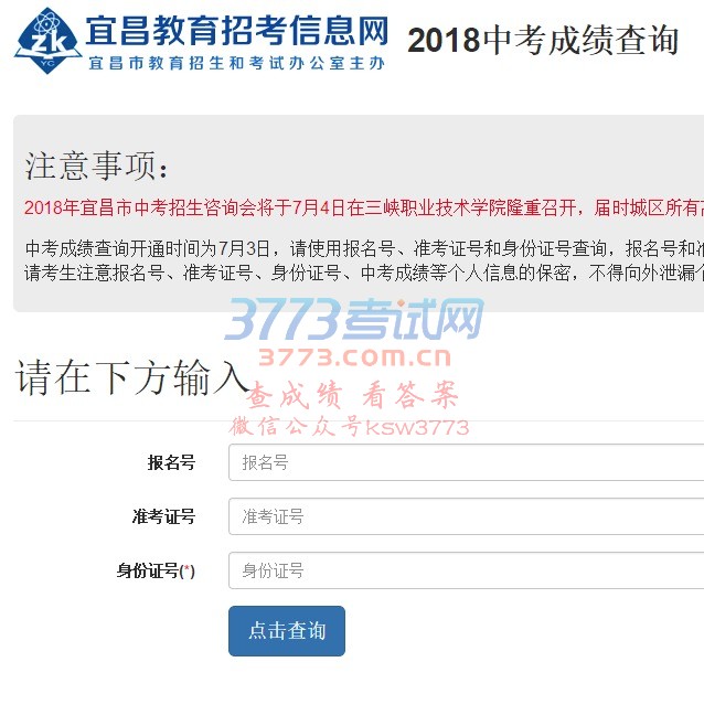 2018年中考成绩查询已经开通 中考成绩查询注意事项:1、2018年宜昌市中考招生咨询会将于7月4日在三峡职业技术学院隆重召开,届时城区所有高中、中职学校将现场为考生咨询解答。2、中考成绩查询开通时间为7月3日,请使用报名号、准考证号和身份证号查询,报名号和准考证号只输入其中一个即可,身份证号为必填项。3、请考生注意报名号、准考证号、身份证号、中考成绩等个人信息的保密,不得向外泄漏个人信息,谨防招生诈骗。