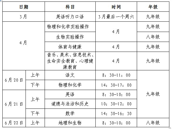 语文150分钟。数学和英语各120分钟,其中英语笔试90分钟,听力口语30分钟。物理和化学(合卷)笔试共150分钟,理化实验操作(合卷)30分钟。道德与法治和历史(合卷)共90分钟。地理和生物(合卷)共90分钟,生物实验操作20分钟。音乐、美术、信息技术、生命安全教育、心理健康教育合计100分钟。