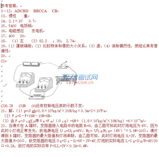 22、当滑片在A端时,变阻器接入电路中的电阻R=0,由乙图可知此时灯泡电压为6V,因为此时小灯泡正常发光,故电源电压U总=UL额=6V;RL= U2L额/PL额=(6V)2÷3.6W=10Ω;滑片滑到B端时,变阻器的最大阻值和灯泡串联,由乙图可知,此时灯泡电压UL=2V,变阻器的最大阻值R=20Ω,故变阻器的电压U变=U总-UL=6V-2V=4V,灯泡的实际电流IL=I变= U变/R=4V/20Ω=0.2A,故灯泡的实际功率P=ULIL=2V×0.2A=0.4W