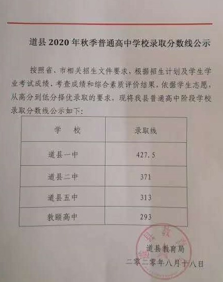 2020永州中考道县高中录取分数线: