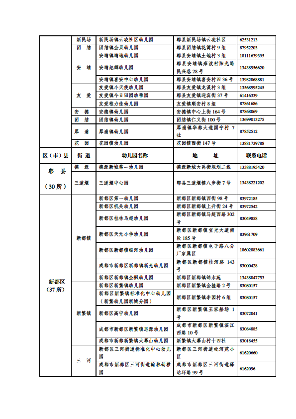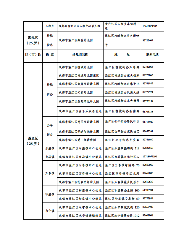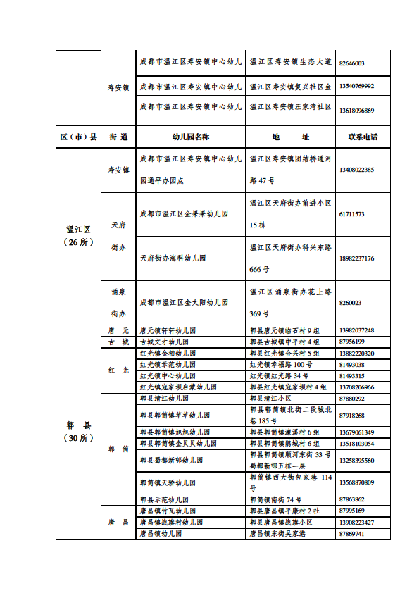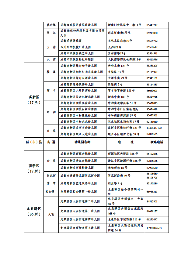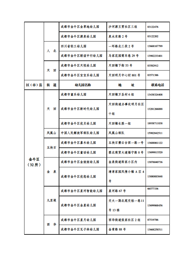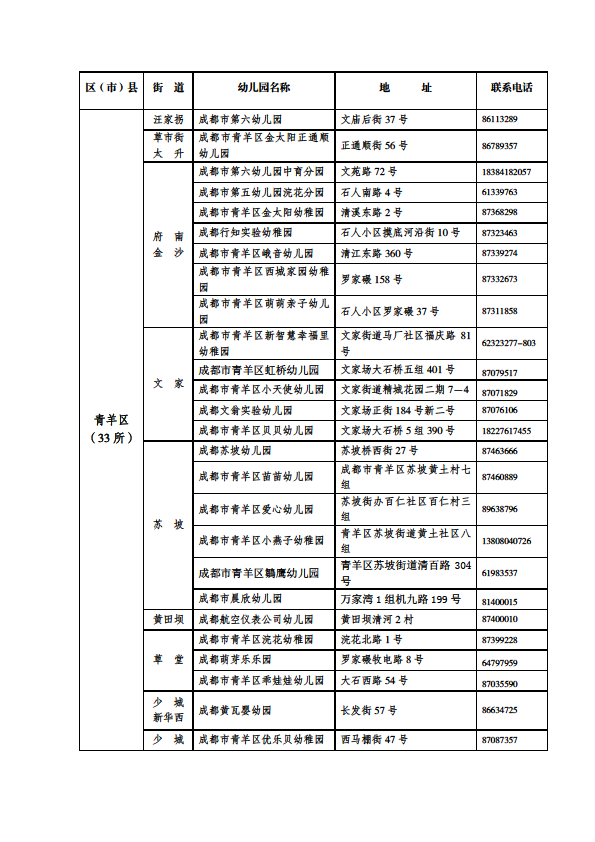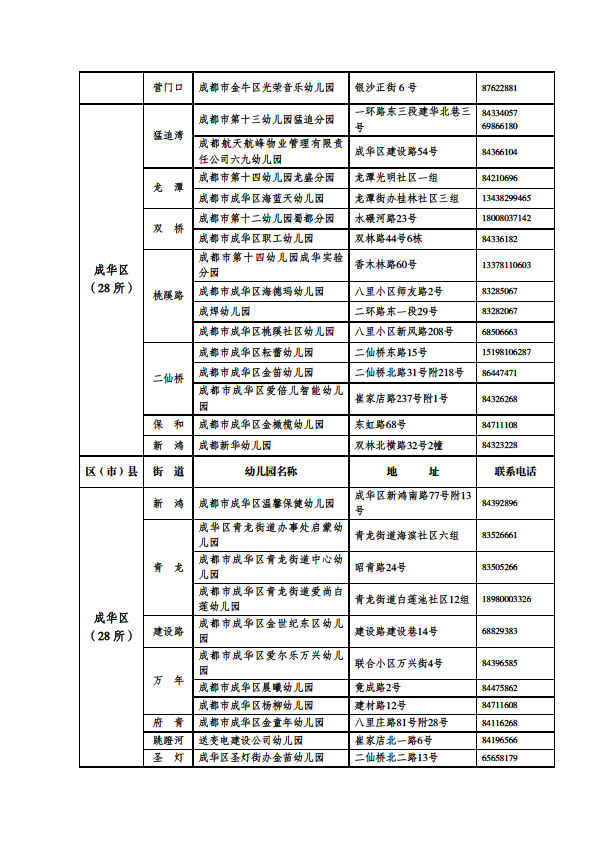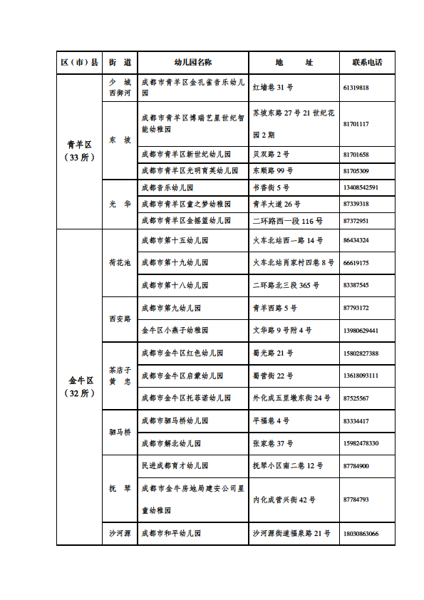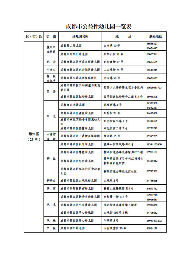 成都市公益性幼儿园一览表
