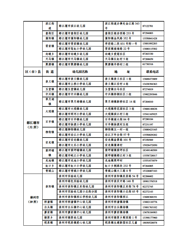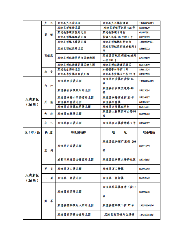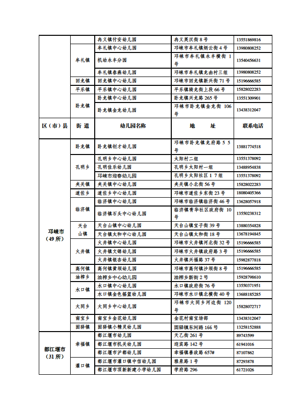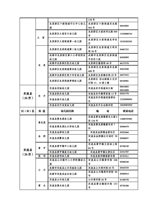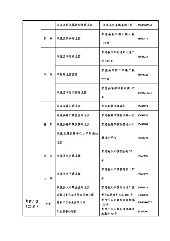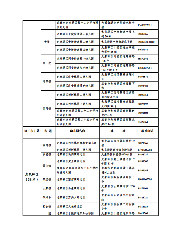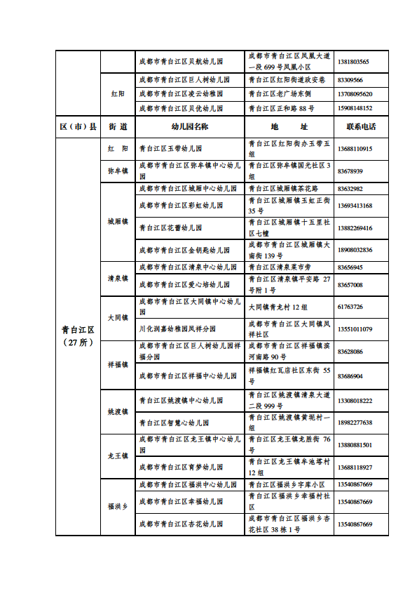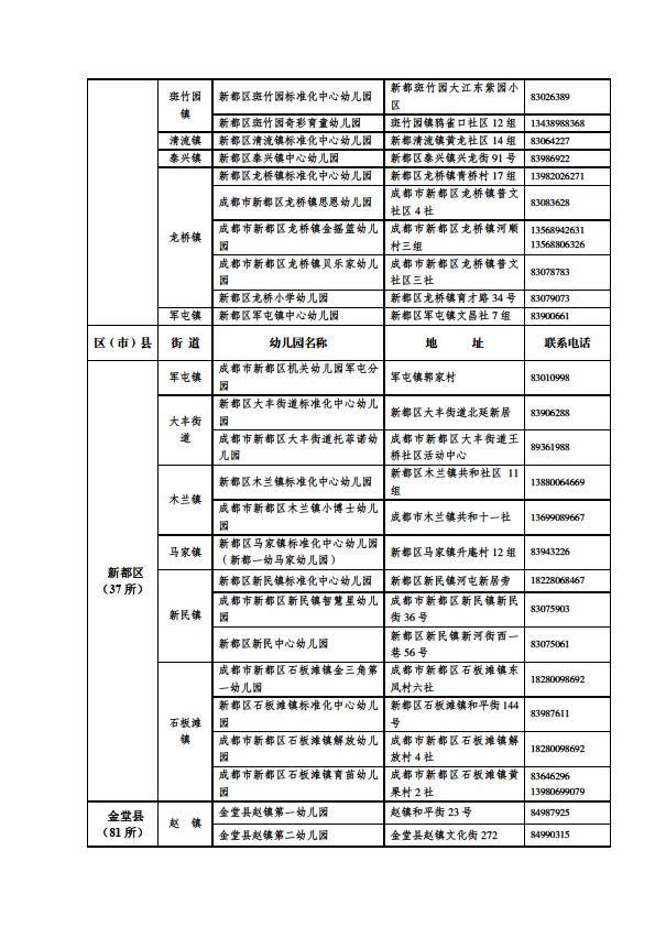 成都市公益性幼儿园一览表