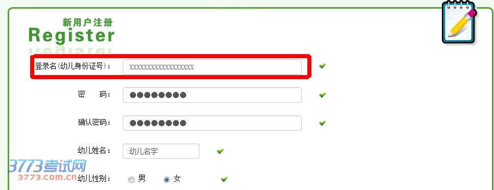 首次使用本系统必须先进行注册,注册用户名为适龄幼儿18位身份证号。