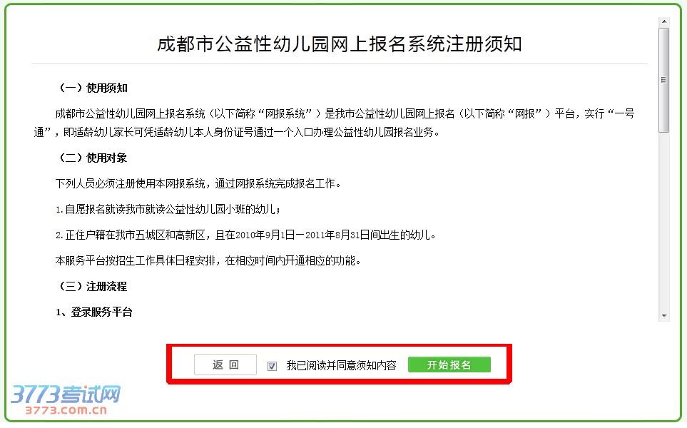 4、登录后请仔细阅读《成都市公益性幼儿园网上报名系统注册须知》,正确理解公益性幼儿园报名的相关规则,然后勾选“我已阅读并同意须知内容”,点击“开始报名”按钮才能进行下一步操作。