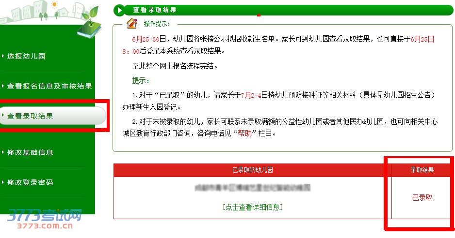 若未被任何一所幼儿园录取,可关注成都市教育局公布的未录取满额公益性幼儿园相关通知,届时本系统会在“温馨提示”栏目中提供相关信息供用户参考。
