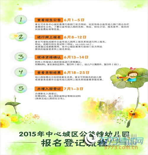 人民网成都3月10日电 (宋艳)3月10日,成都市教育局下发《关于做好2015年公益性幼儿园招生工作的通知》,今年中心城区公益性幼儿园网上报名时间为6月8-12日。