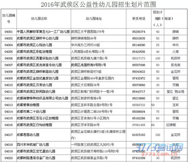 招生计划 2016年,武侯区37所公益性幼儿园秋季学期招生学位1760个。金牛区32所公益性幼儿园秋季学期招生学位1890个。锦江区34所公益性幼儿园秋季学期招生学位1615个。成华区30所公益性幼儿园秋季学期招生学位1825个。青羊区33所公益性幼儿园秋季学期招生学位2720个。天府新区成都直管区34所公益性幼儿园2016年秋季学期招生学位2753个。 成都高新区通过社区和幼儿园公布了公益性幼儿园招生计划及划片区域。 报名流程 1、按照教育局安排,6月13—17日,网上报名。 2、6月18—19日,家长到网上所报幼儿园的现场进行资格确认。 3、6月23—29日,各公益性幼儿园张榜公示拟录取新生名单,家长可到报名的幼儿园或者登录成都市公益性幼儿园网上报名系统查看录取结果。 4、7月1—3日,家长持户口簿、幼儿预防接种证等相关材料到幼儿园办理新生入园手续。 划片范围 金牛区 点击查看大图 成华区 点击查看大图 锦江区 点击查看大图 青羊区 点击查看大图 武侯区 点击查看大图 天府新区成都直管区 特别提醒! 家长在进行网上报名操作时,不得填错幼儿户口所在街道,填错将影响幼儿的正常录取。 确认幼儿户口所在街道方法为:查看户口簿中幼儿所在页左下角“承办人签章”处的派出所名称,如:户口簿中幼儿所在页左下角“承办人签章”处显示为“玉林派出所”,则适龄幼儿户口所在街道为“玉林街道”。