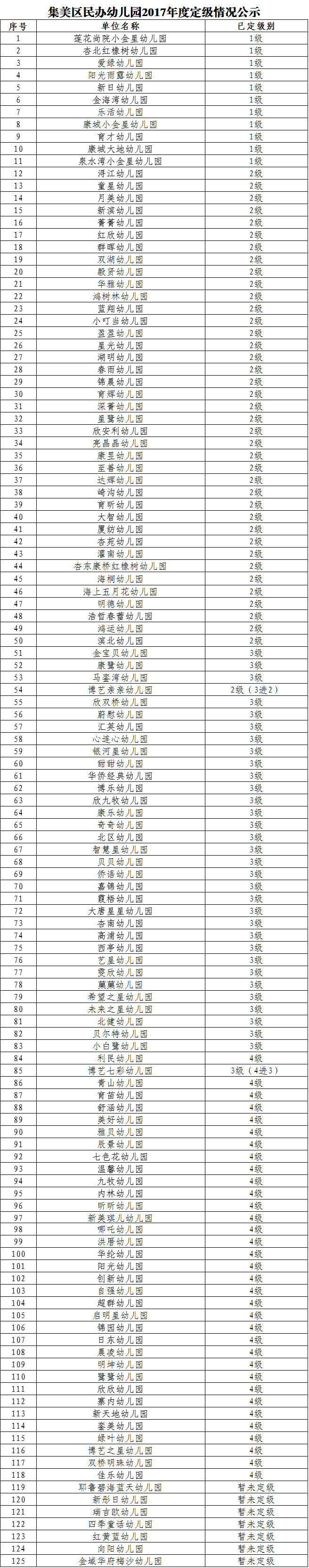 厦门集美区民办幼儿园2017年度定级情况公示