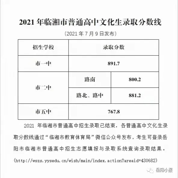 临湘市2021年普通高中招生录取已结束,各普通高中文化生录取分数线通过“临湘市教育体育局”微信公众号发布,考生可登陆临湘市普通高中招生志愿填报与录取系统查询录取结果。(http://wszs.yysedu..cn/wish/main/index.action?areaid=430682)
