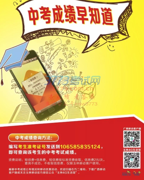 查分预告:玉林中考成绩将于7月11日上午12点公布!据了解,今年我市共有88165名考生报名参加中考。目前,市教育局正在组织人员进行计算机辅助无纸化阅卷,预计到7月10日左右全市中考阅卷工作结束,7月11日中午12时起,全市中考成绩可以通过以下方法进行查询。下面送上查分方式↓↓