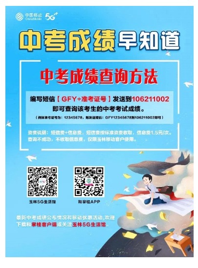 我市2021年全市普通高中招生工作于7月12日正式开始,录取最低控制分数线预计7月11日9时30分公布。届时,玉林市教育局将通过玉林市各主流媒体、玉林市教育局官网(http://edu.yulin.gov.cn)和官方微信(玉林市教育局)发布信息;预计7月11日10时起,考生可通过短信查询、声讯查询、网络查询等3种方式查询个人中考成绩。
