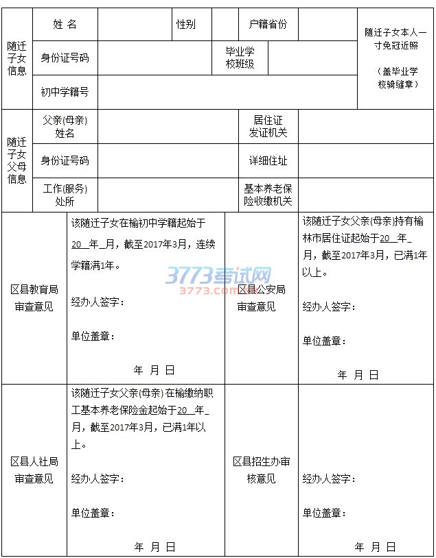 进城务工随迁子女在榆林参加中考报名申请表