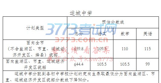 运城中学计划类型预估分数线总分语文数学英语面向全市(不含盐湖区、市直、运城经济开发区、绛县)统招659.8109.5110115面向盐湖区、市直、运城经济开发区统招644.4105.5105.599运城中学分配到各初中学校计划的定向生录取最低分为面向盐湖区、市直、运城经济开发区统招分数线下降50分。备注:录取以总分排序为准。如遇总分相同,则参照语文成绩。如语文成绩相同,再参照数学成绩。如数学成绩仍相同,则再参照英语成绩。