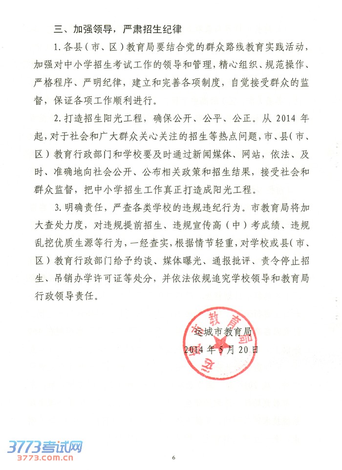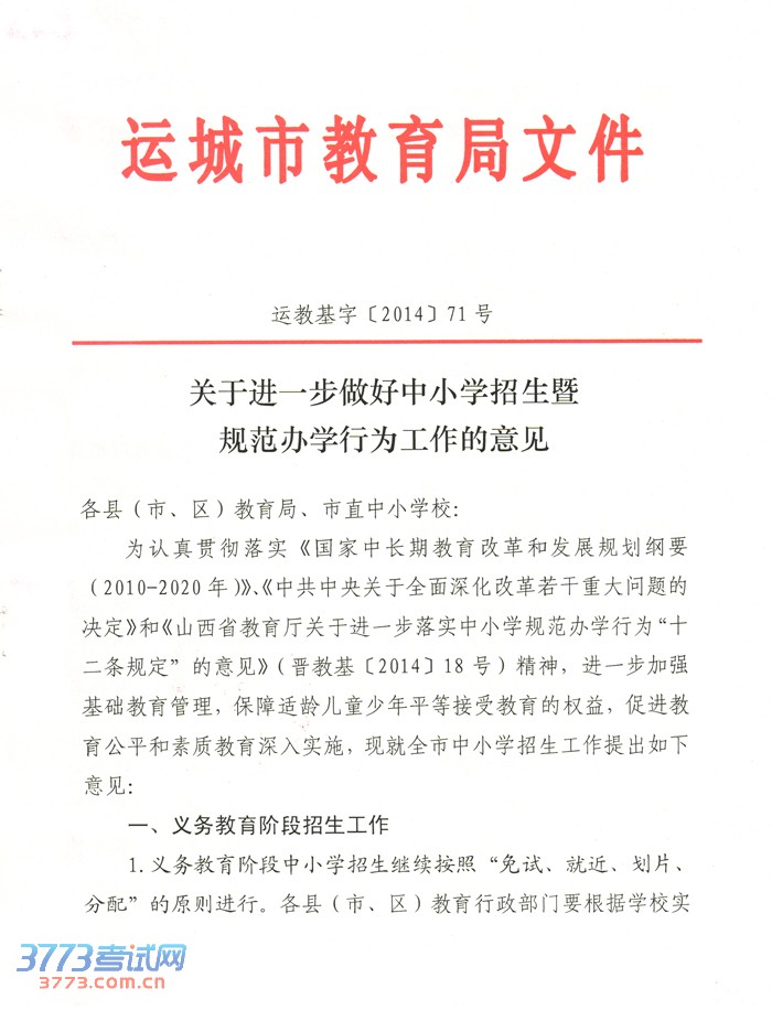 2014年运城市直义务教育中小学招生工作的意见